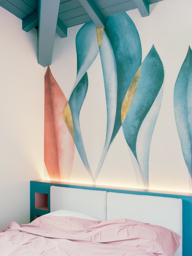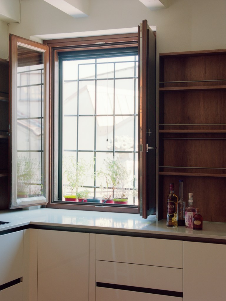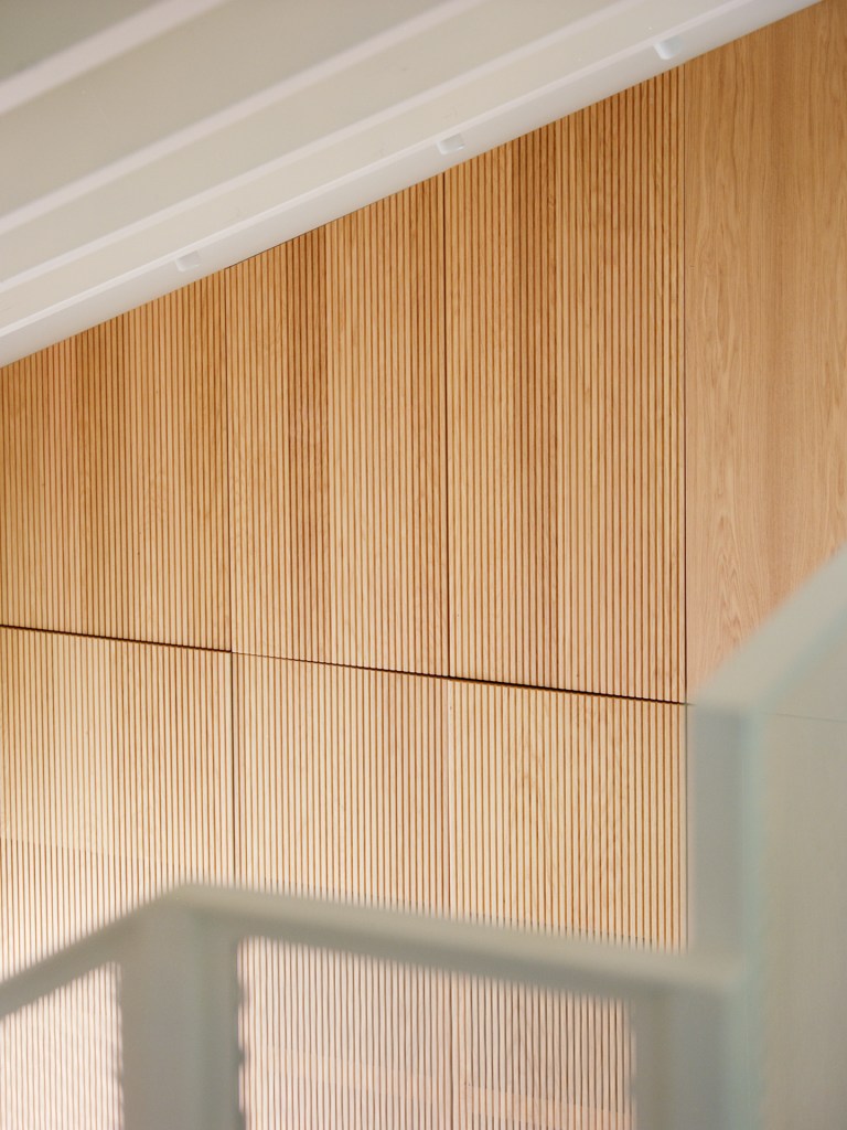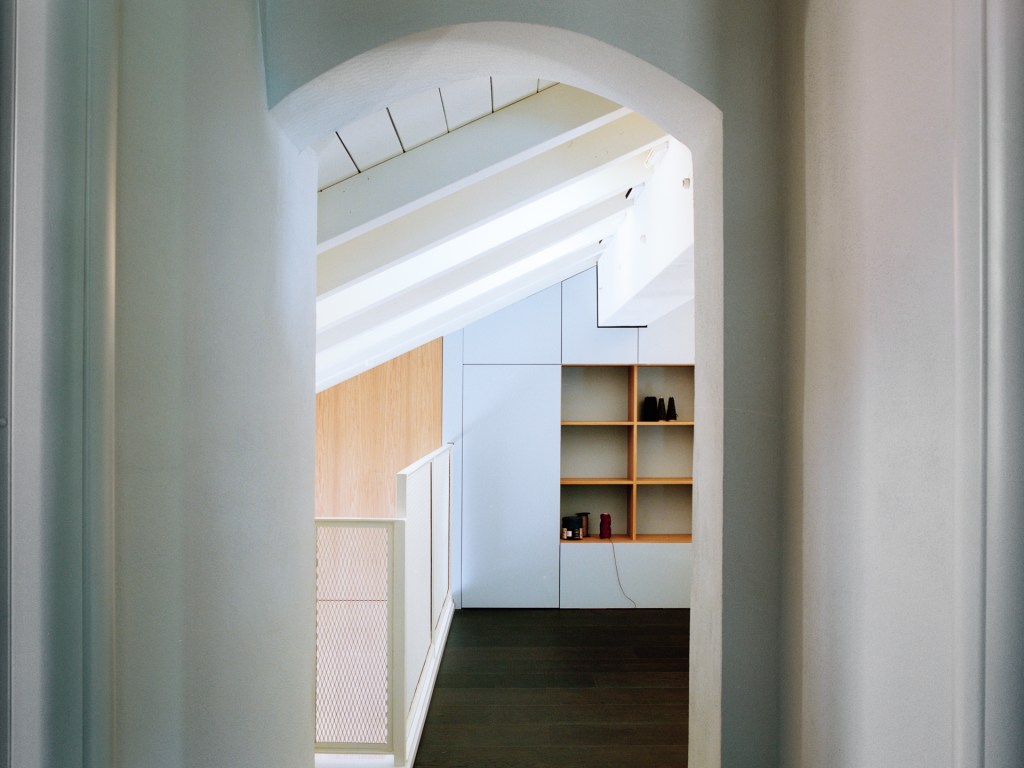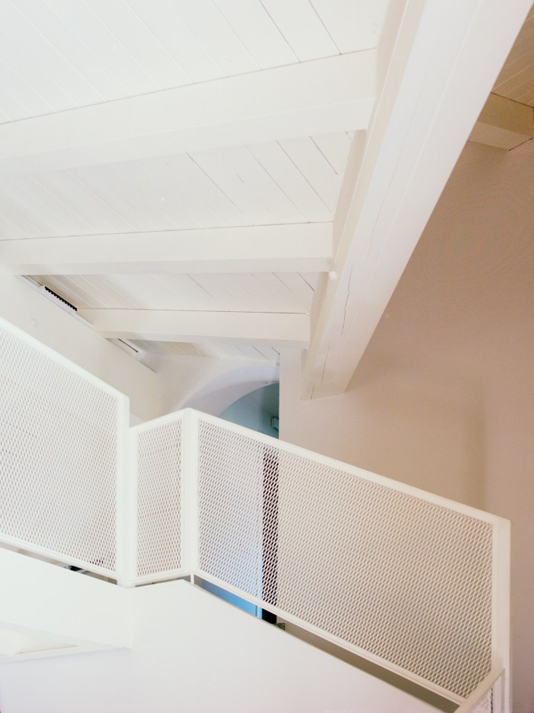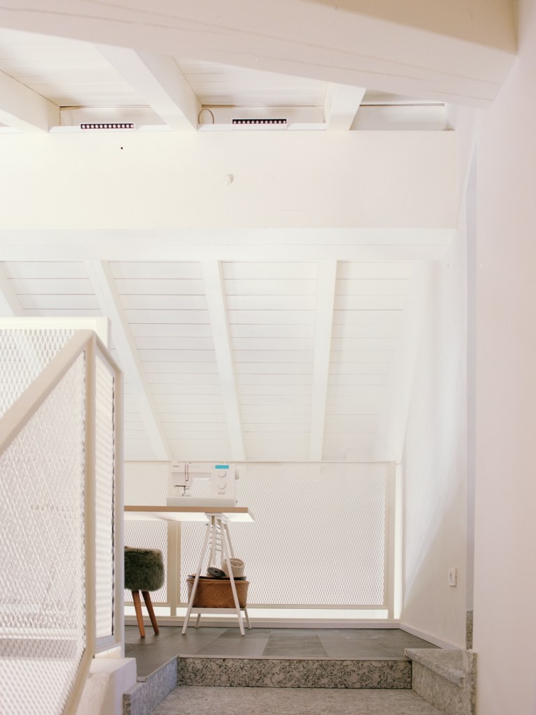 Per aumentare la luminosità e alleggerire la percezione dell’ambiente, tutte le travi e i componenti lignei del tetto sono stati sbiancati, creando un senso di ampiezza e continuità visiva.