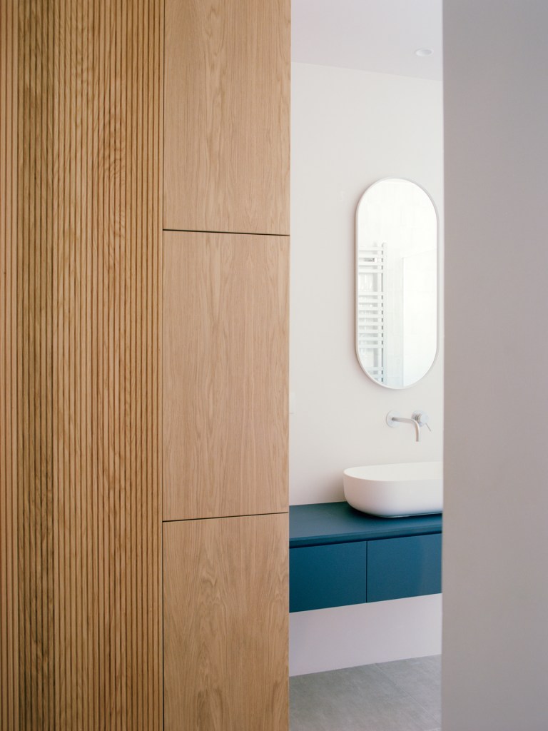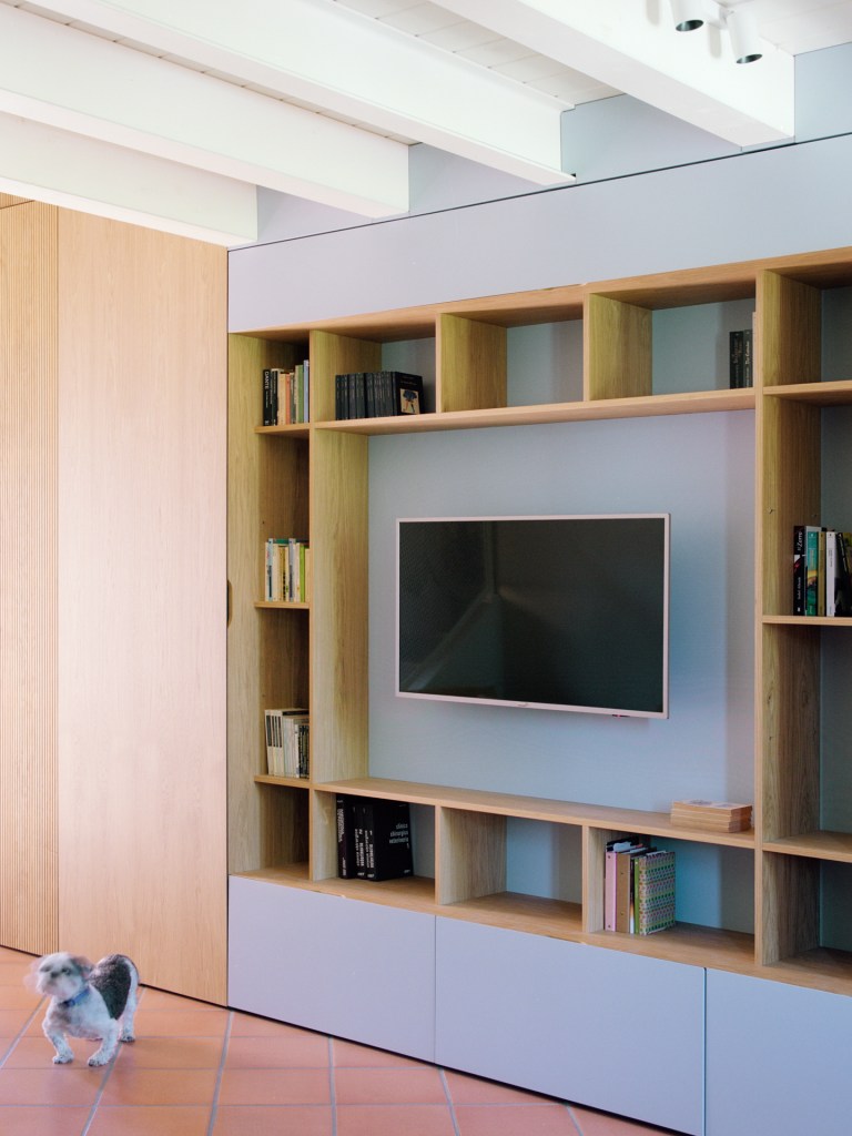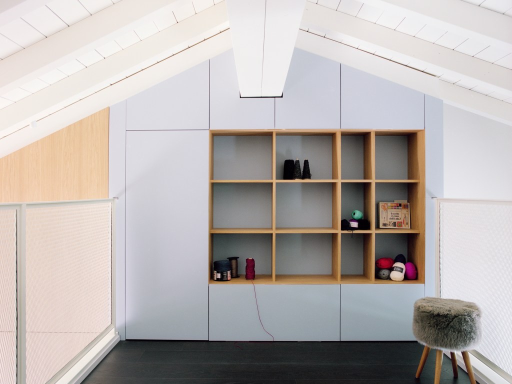 Il living a doppia altezza rappresenta il cuore della casa. Qui è stato realizzato un soppalco di 10 mq, ora completamente abitabile, pensato come area ricreativa e come estensione naturale della zona giorno. L’elemento che connette i due livelli è un mobile su misura che si sviluppa in continuità dal piano terra fino al soppalco, articolato con tre finiture: rovere rigato, rovere naturale e rovere laccato nel tono Bright Sky.